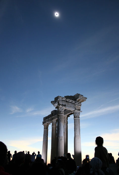圖為2006年3月29日,在土耳其阿波羅神廟前人們正在觀測日全食景觀。