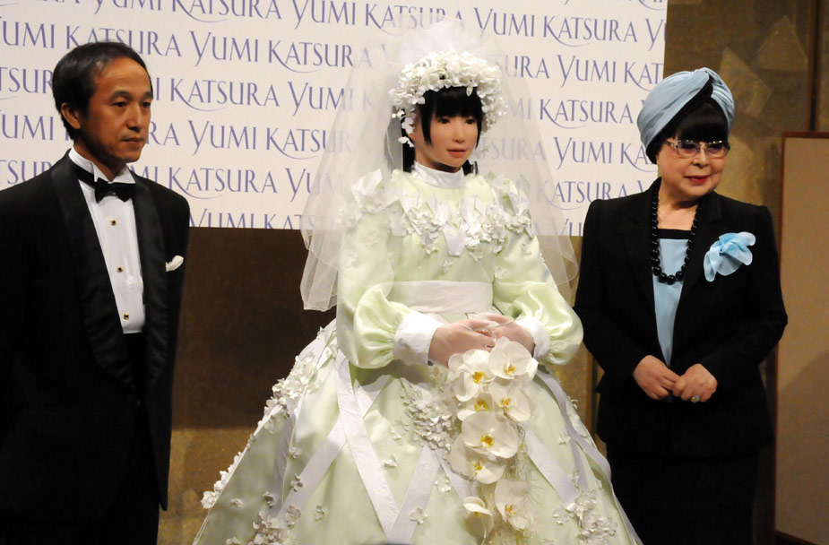 7月22日,日本大阪,類人機(jī)器人“HRP-4C”身穿由著名婚紗設(shè)計(jì)師為其量身定做的婚紗亮相。>>點(diǎn)擊觀看視頻