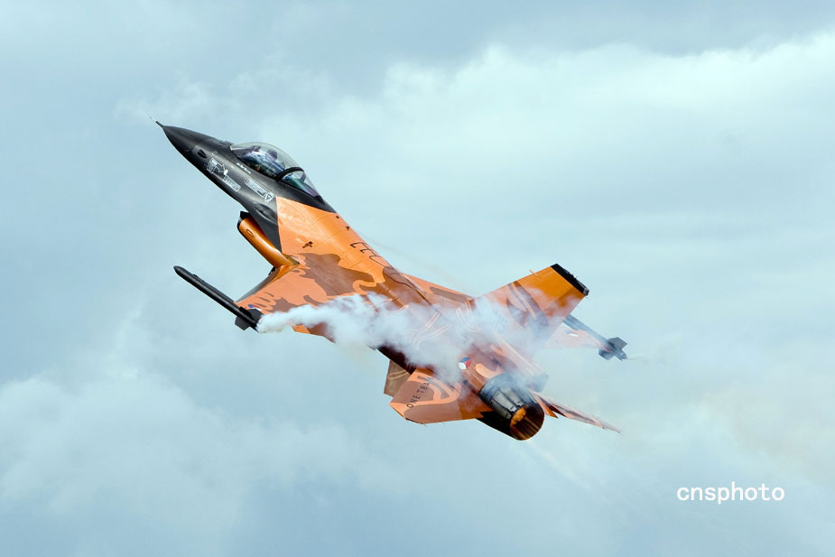 2009年7月,“2009英國費爾福德航展”在英格蘭費爾福德開展。圖為荷蘭皇家空軍F-16戰(zhàn)斗機,荷蘭皇家空軍此次以少見的橙色圖裝F-16戰(zhàn)斗機在航展上亮相。中新社發(fā) 潘禹 攝