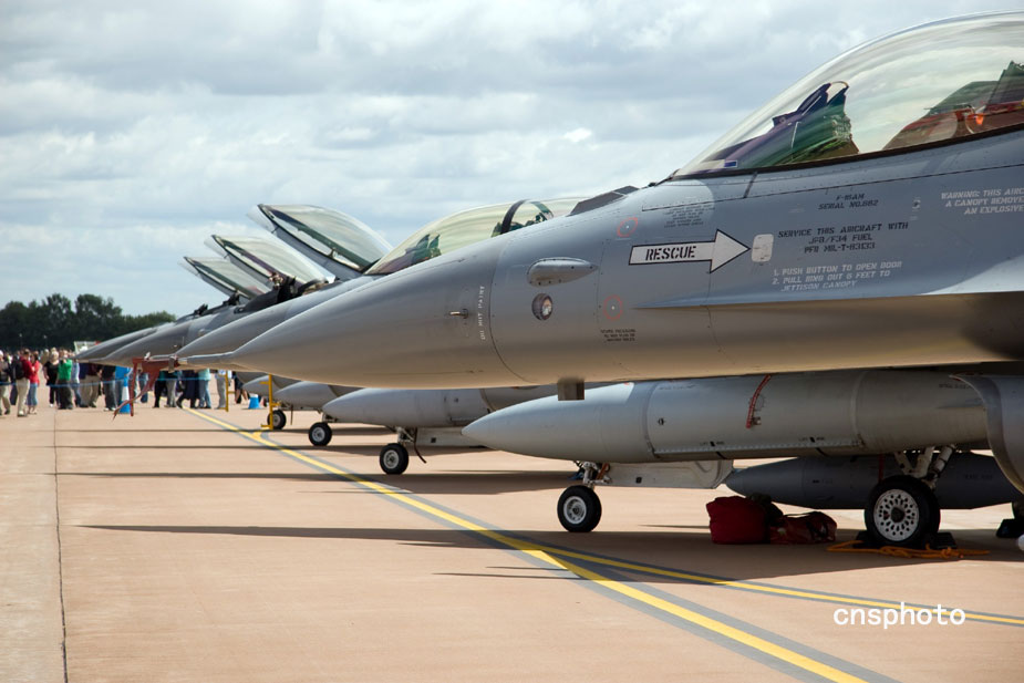 2009年7月,“2009英國費爾福德航展”在英格蘭費爾福德開展。圖為費爾福德航展上,來自各國空軍的F-16戰斗機在停機坪上依次排開,氣勢逼人。中新社發 潘禹 攝