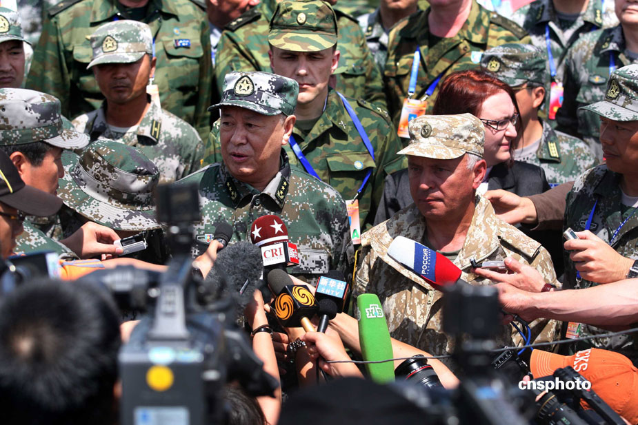 中國、俄羅斯兩軍總參謀長,7月23日上午到沈陽軍區洮南合同戰術訓練基地,觀看“和平使命2009”聯合反恐軍事演習。雙方以陸軍和空軍為主,中方參演部隊包括1個陸軍戰斗群和1個空軍戰斗群。俄方參演兵力包括1個陸軍加強摩步營、1個空降突擊連和部分空軍兵力,雙方投入兵力兩千多人。中新社發 宋吉河 攝