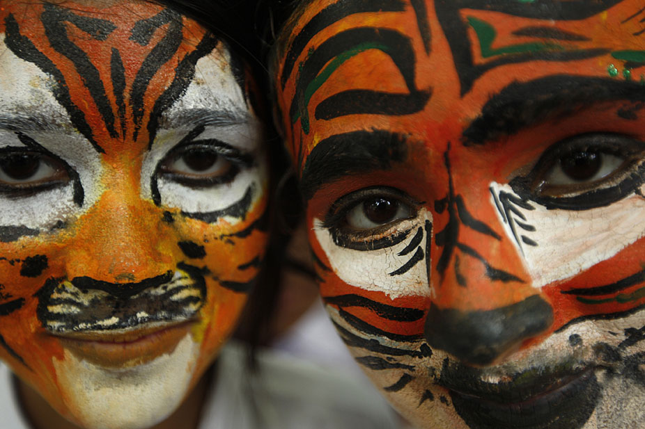 7月28日,約2000名學(xué)生在新德里化妝成老虎的臉譜,圍坐成老虎的造型,與官員和野生動物專家們一起呼吁人們保護(hù)孟加拉虎和其他野生動物。