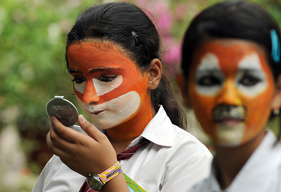 7月28日,約2000名學生在新德里化妝成老虎的臉譜,圍坐成老虎的造型,與官員和野生動物專家們一起呼吁人們保護孟加拉虎和其他野生動物。