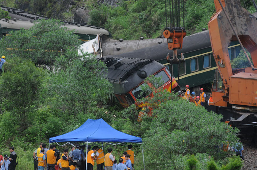 2009年7月29日4時(shí)22分,由襄樊開往湛江的1473次旅客列車運(yùn)行至焦柳線廣西境內(nèi)古砦至寨隆間,因連日持續(xù)強(qiáng)降雨造成山體崩塌掩埋線路,列車機(jī)車及機(jī)后1-4位車輛脫軌,造成4名旅客死亡,50余名旅客受傷,焦柳線中斷行車。劉柳柳 攝/CFP