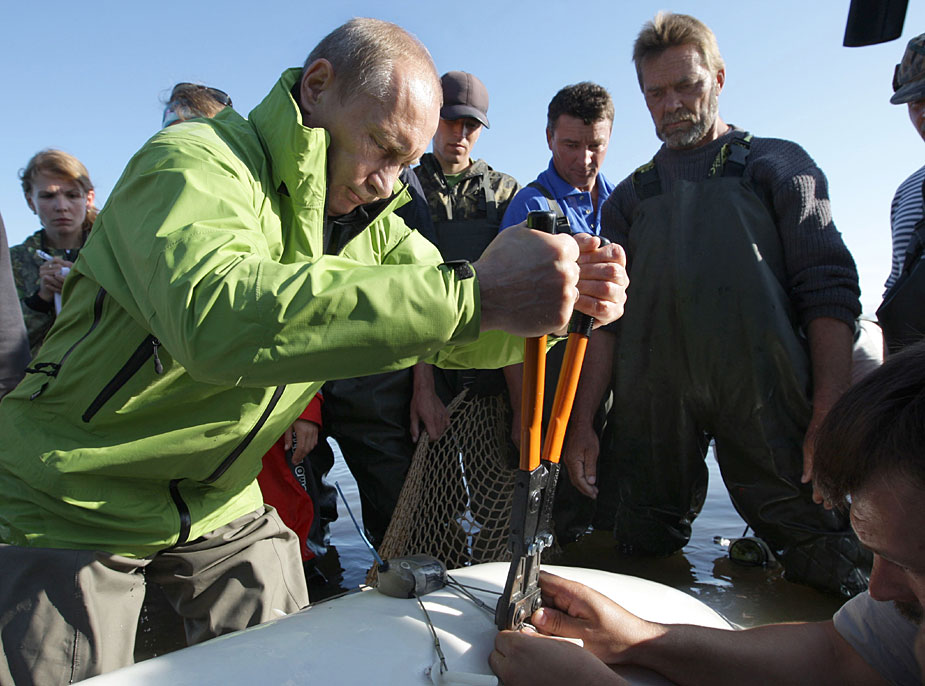俄羅斯總理普京7月31日在太平洋的契卡洛夫島為一條白鯨裝上衛星追蹤器。其后他更幫手喂其他白鯨魚吃。