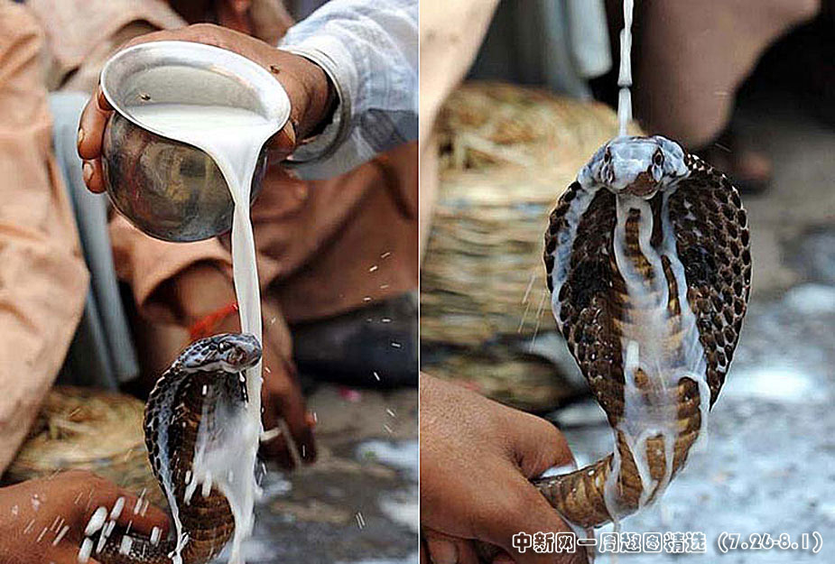 7月26日,印度北部城市阿姆利則一座印度教神廟內,耍蛇人將眼鏡蛇浸入牛奶中。點擊觀看詳細內容