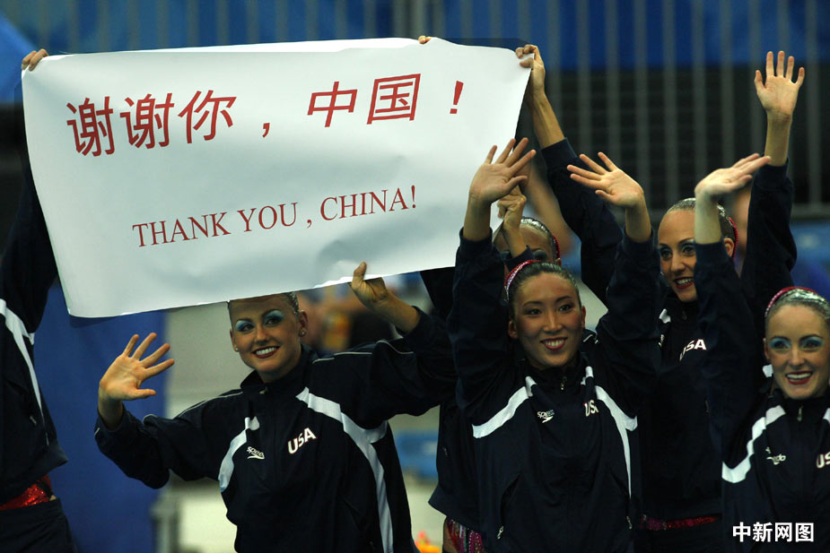 謝謝你中國——8月23日,美國花游隊隊員入場時,打出“謝謝你,中國”的條幅。