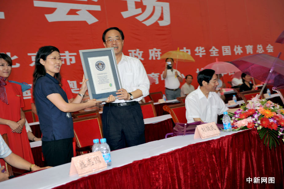 圖為世界吉尼斯總部認證官將認證書頒發(fā)給北京市副市長劉敬民。