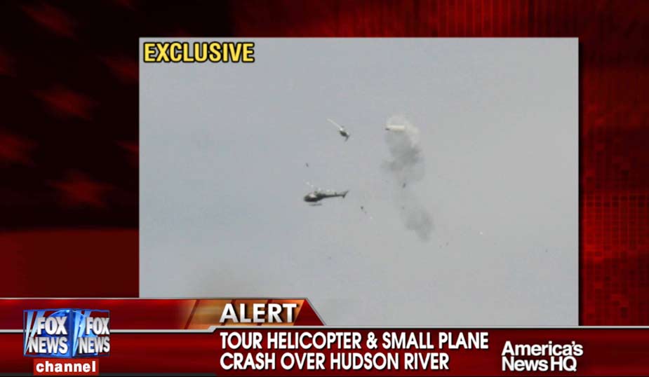 8月8日,紐約市曼哈頓西側的哈德遜河上空,一架觀光直升飛機和一架小型飛機相撞,兩飛機雙雙墜入河中。據稱觀光直升飛機上載有五名意大利游客和一名飛行員,而小型飛機上則有三人。圖為電視臺播放的兩飛機相撞的視頻截圖。