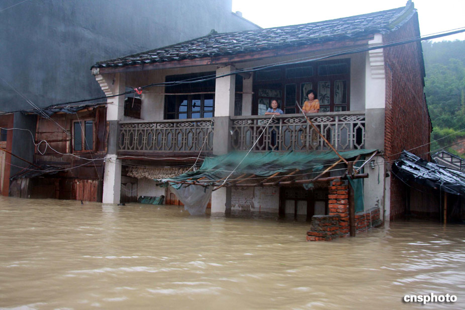 八月九日,受臺風“莫拉克”強降雨的影響,福建寧德福鼎南墘村大面積受淹,大水同時也將通往該村的道路全部淹沒,致使該村猶如“孤島”,該村近三百名村民被困。中新社發 彭登筍 攝
