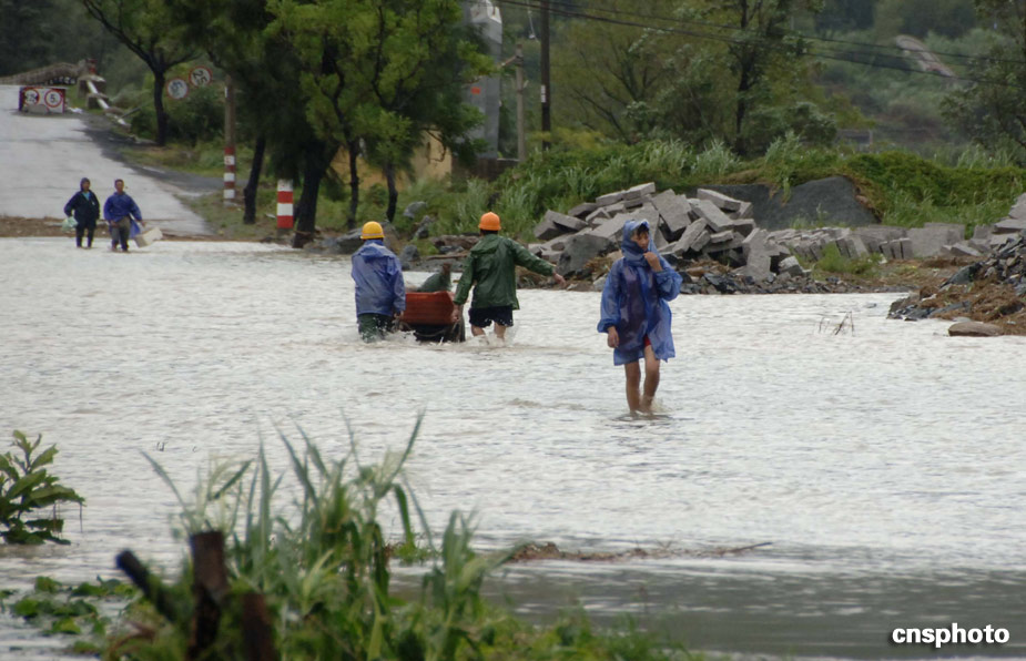 8月9日16時20分,第8號臺風“莫拉克”在福建省霞浦縣沿海登陸,登陸時臺風中心最大風速12級(33米/秒),中心氣壓970百帕。“莫拉克”帶來的強降雨致使福建霞浦許多路段被淹。中新社發 王東明 攝