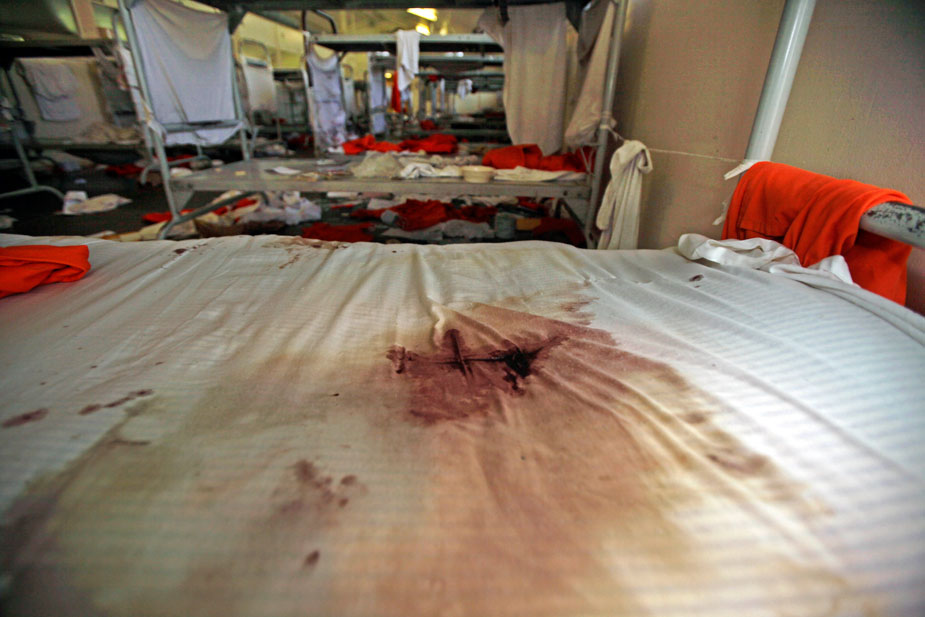 圖為奇諾監獄宿舍被血染紅的床鋪。8月8日晚至9日凌晨,美國加州南部奇諾市發生大規模監獄騷亂,截至目前,在250多名受傷的在押犯人中,仍有16名犯人在醫院接受治療。
