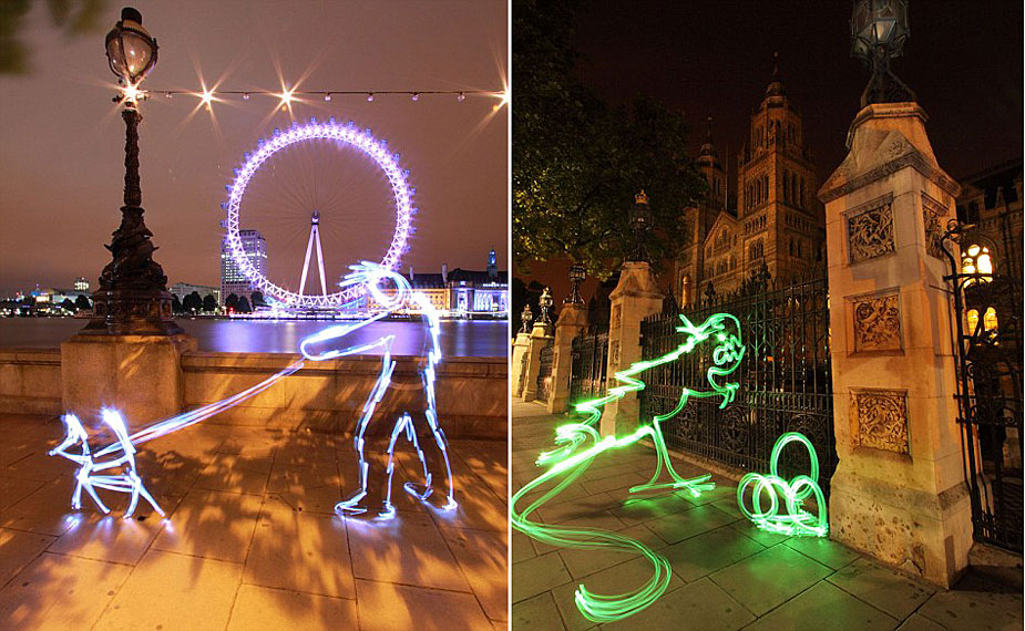 攝影師Michael Bosanko在英國倫敦拍攝的名為“溜狗的人”(左)和“恐龍”的光涂鴉照片。