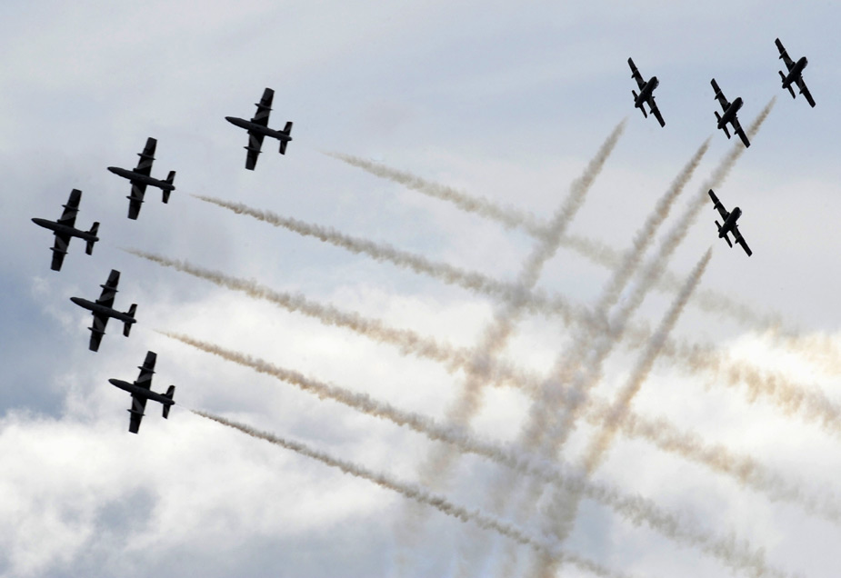 圖為意大利空軍“三色箭”飛行隊精彩的特技飛行表演。