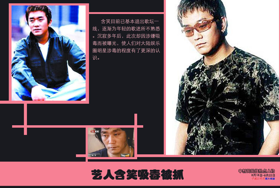 中新網(wǎng)本周熱點(diǎn)人物之——含笑 北京警方十四日證實(shí),市公安局禁毒處根據(jù)線索,在京城的兩個(gè)城區(qū)相繼查獲十名涉嫌吸毒人員并起獲部分毒品,這十名吸毒者中包括了中國著名歌手含笑。