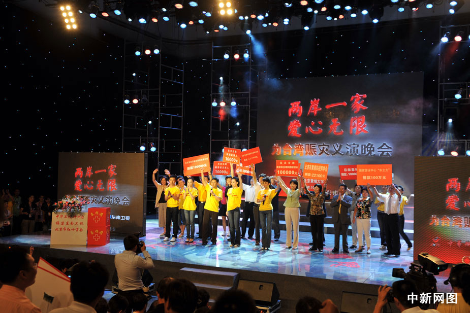 8月22日晚,北京舉行“兩岸一家 愛心無限”為臺灣同胞賑災義演晚會,大陸和臺灣演藝界明星登臺為臺灣災區同胞共獻愛心,晚會臨近結束時共收到各界捐款3000多萬元。中新網記者 金碩 攝