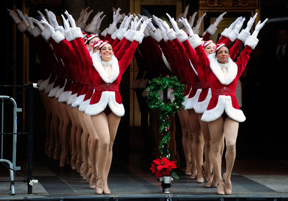 8月25日,美國“火箭女郎”舞蹈團身著圣誕裝在無線電城音樂廳(Radio City Music Hall)前演出。來源:中國新聞網