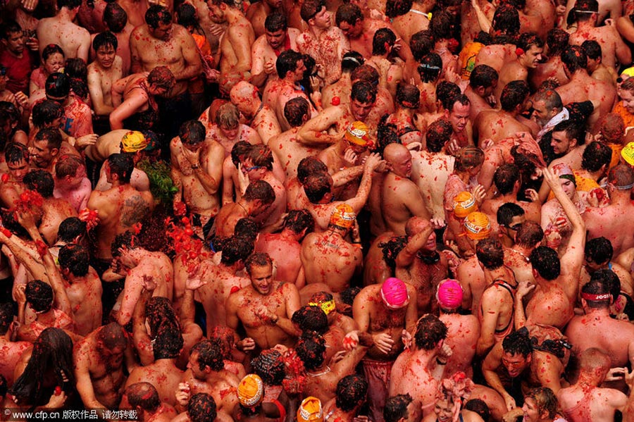 8月26日,西班牙東南部小鎮Bunol當日迎來傳統的西紅柿節。大約4萬名狂歡者在1小時內扔掉了11萬公斤西紅柿。來源:中國新聞網