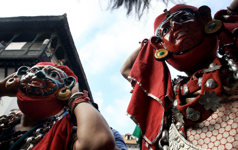 圖為節日當天人們戴上傳統的尼泊爾面具載歌載舞。