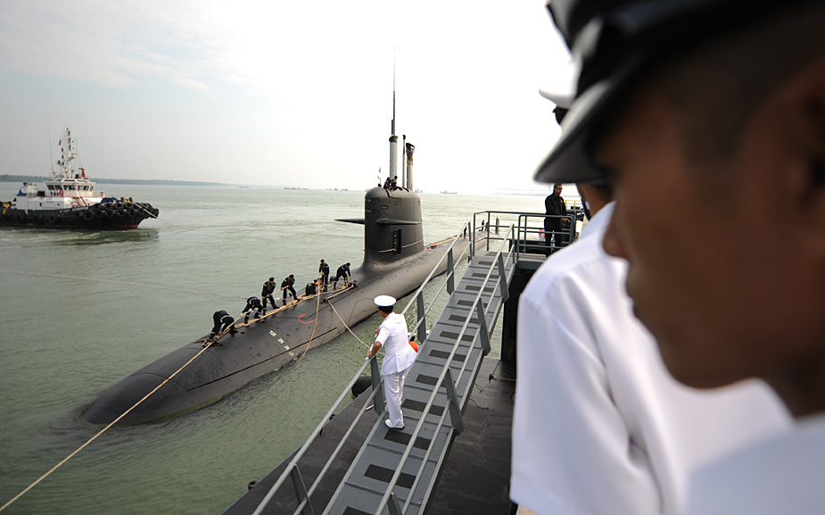 9月3日,由法國制造的馬來西亞首艘“鲉魚”級潛艇“東古·阿卜杜勒·拉赫曼”號駛入馬來西亞首都吉隆坡的克朗港。圖片來源:中國新聞網