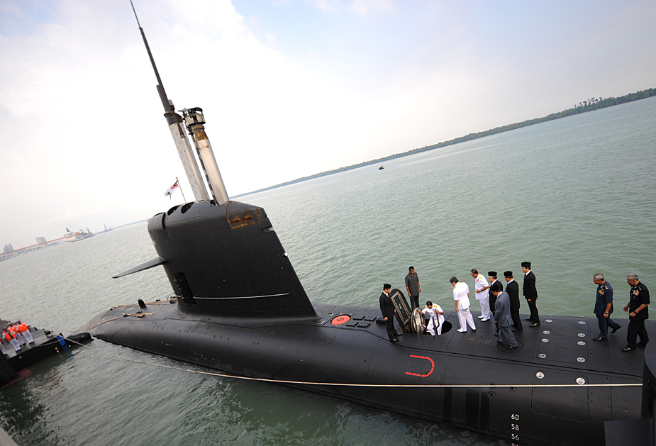 9月3日,由法國制造的馬來西亞首艘“鲉魚”級潛艇“東古·阿卜杜勒·拉赫曼”號駛入馬來西亞首都吉隆坡的克朗港。圖片來源:中國新聞網