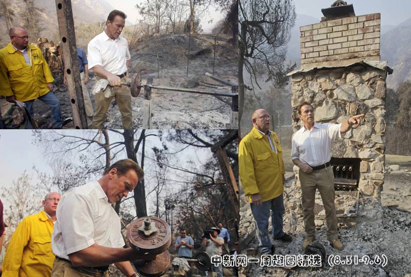當?shù)貢r間9月3日,加州州長施瓦辛格探訪了洛杉磯市圖洪加附近被火災燒毀的地區(qū)。圖片來源:中國新聞網(wǎng)