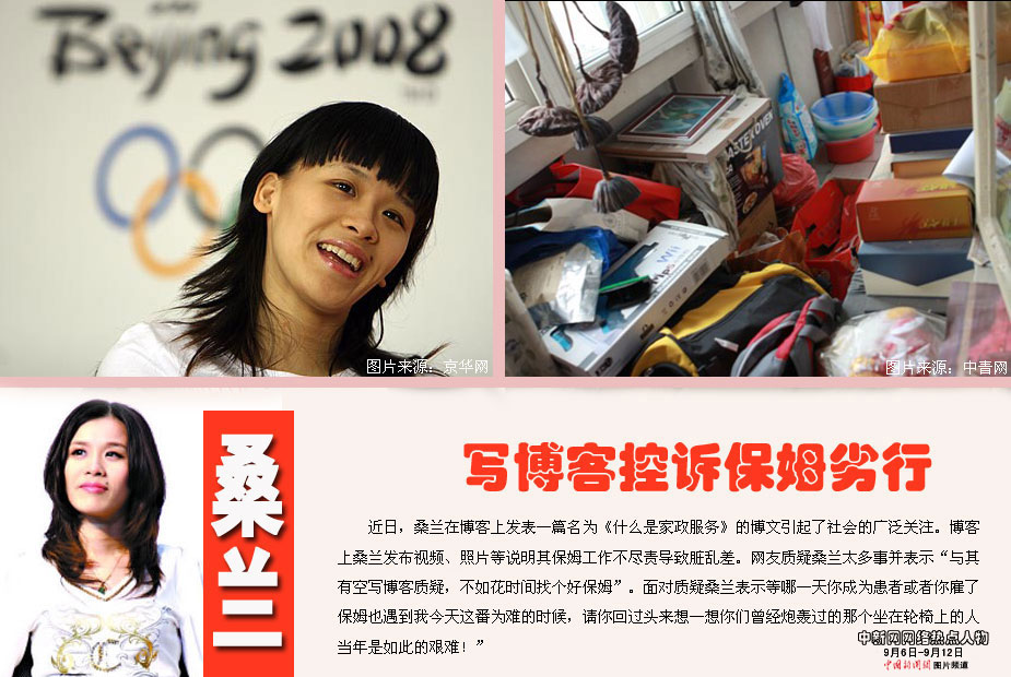 中新網(wǎng)本周熱點人物之——桑蘭 近日,桑蘭在博客上發(fā)表一篇名為《什么是家政服務》的博文引起了社會的廣泛關注。博客上桑蘭發(fā)布視頻、照片等說明其保姆工作不盡責導致臟亂差。有網(wǎng)友質(zhì)疑桑蘭太多事并表示“與其有空寫博客質(zhì)疑,不如花時間找個好保姆”。面對質(zhì)疑桑蘭稱“別以為‘輪椅事件’ ‘神醫(yī)門’‘保姆門’就認為我是個怨婦或者那么唧唧歪歪。等哪一天你坐上輪椅乘飛機,你成為患者或者你雇了保姆也遇到我今天這番為難的時候,請你回過頭來想一想你們曾經(jīng)炮轟過的那個坐在輪椅上的人當年是如此的艱難!”