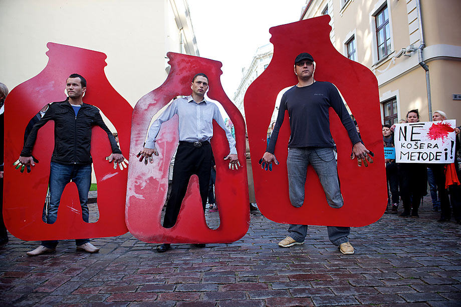 9月17日,在拉脫維亞首都里加,抗議者舉行示威游行活動,反對屠宰動物。圖片來源:中國新聞網