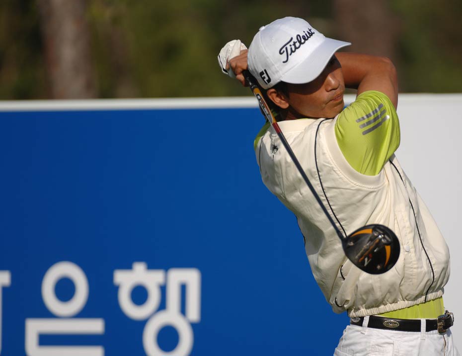 2009“韓國KEB銀行”中韓職業高爾夫球巡回賽韓國站于今天在韓國OSTAR高爾夫球俱樂部正式開桿,有47名球員代表中國參賽。圖為選手們上場第一天,揮桿開打的場面。