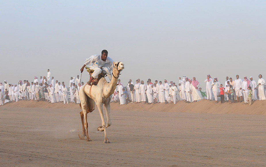 9月25日,在沙特阿拉伯東部的哈利斯,駱駝騎士們騎著自己的座駕在大漠中飛馳。圖片來源:中國新聞網