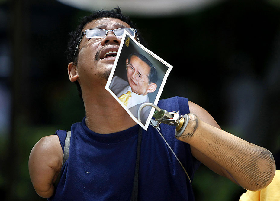 22日,在泰國首都曼谷,一名男子在醫院外為普密蓬·阿杜德的健康祈禱。 81歲高齡的泰國國王普密蓬·阿杜德于19日因發燒住進醫院接受治療。圖片來源:中國新聞網