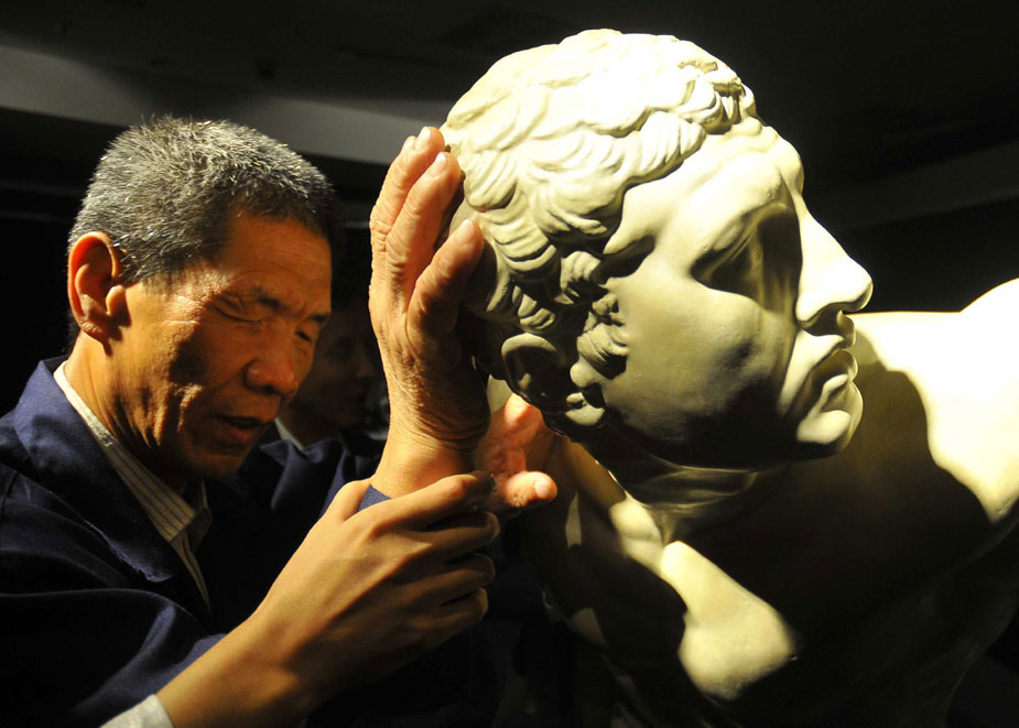 21日,由法國盧浮宮博物館、中華世紀壇世界藝術館等機構聯(lián)合主辦的《觸·覺——從盧浮宮到世紀壇》藝術展在中華世紀壇世界藝術館開幕,共展出公元前二世紀到十九世紀西方經典雕塑的復制品和中國當代藝術品二十三件。這是中國大陸首次為視覺殘障人士舉辦的藝術展。該展十一月起開始在福州、武漢及香港等地巡展。圖為視障人士利用觸覺方式欣賞精典作品。潘旭臨 攝圖片來源:中國新聞網