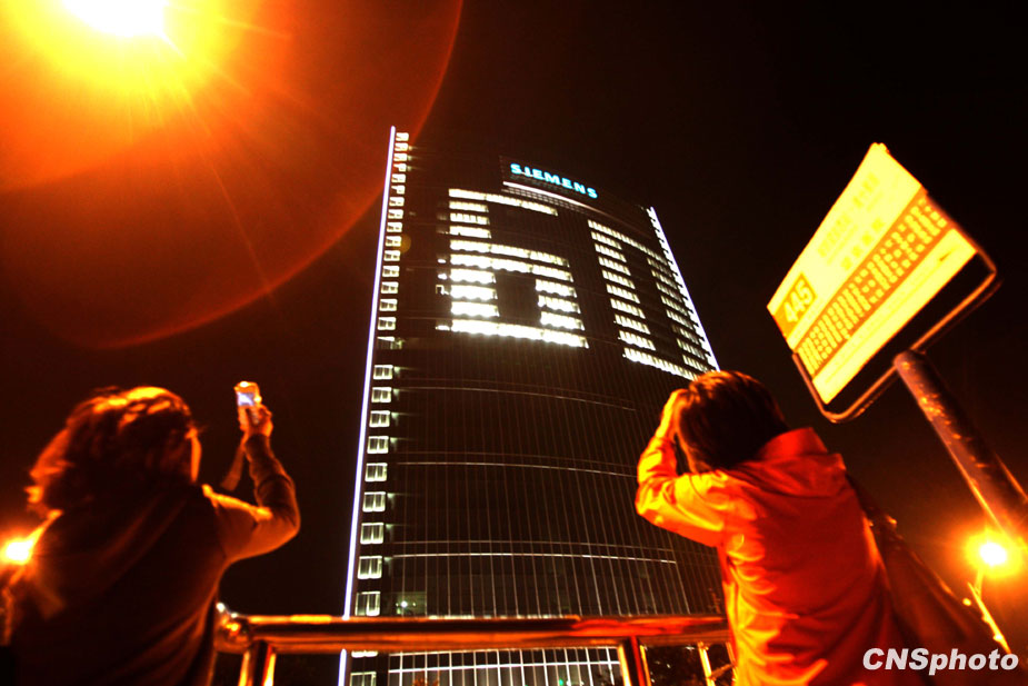 9月28日晚,北京一外企辦公大樓點亮“60”字樣,慶祝新中國成立60周年。中新社發 張宇 攝