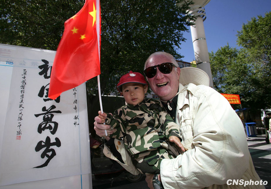 9月27日上午,為迎接國(guó)慶60周年,武警西藏總隊(duì)官兵為駐地群眾開(kāi)展擁政愛(ài)民、服務(wù)群眾便民活動(dòng)。一位外國(guó)游客抱著中國(guó)孩子,在武警官兵的書法作品“祖國(guó)萬(wàn)歲”前,一起搖動(dòng)五星紅旗,共慶新中國(guó)國(guó)慶60周年。 中新社發(fā) 錢檬 攝