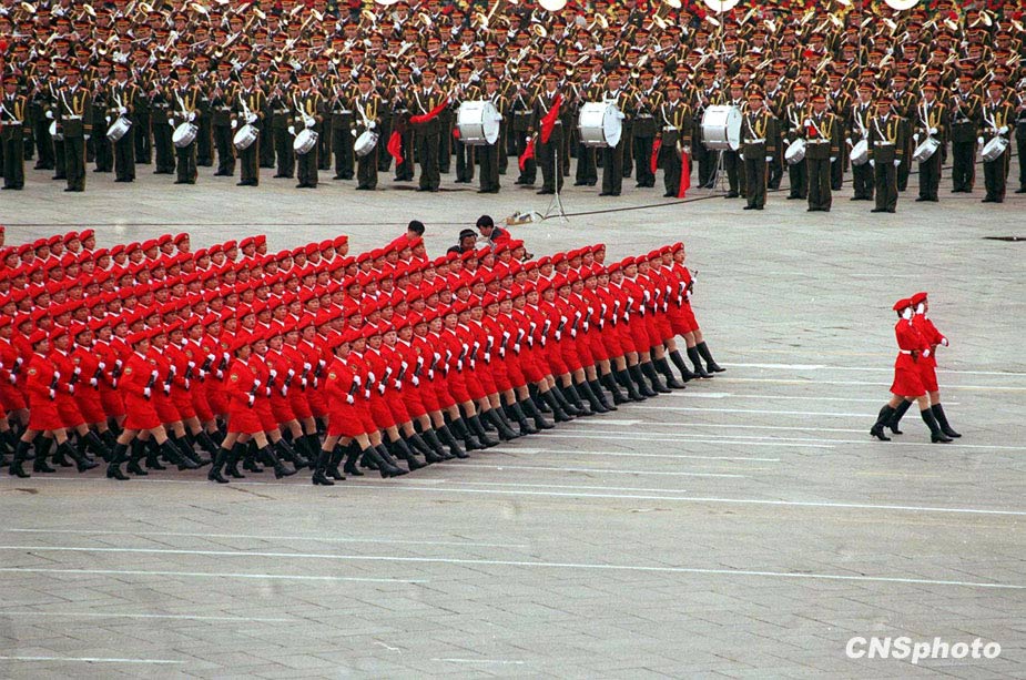 國(guó)慶50周年閱兵的女民兵方隊(duì)經(jīng)過(guò)天安門廣場(chǎng)。中新社發(fā)