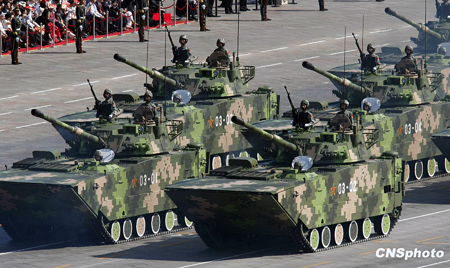 2009年10月1日,中華人民共和國成立60周年慶祝大會在北京天安門廣場舉行。圖為兩棲突擊車方隊。中新社發 趙振清 攝