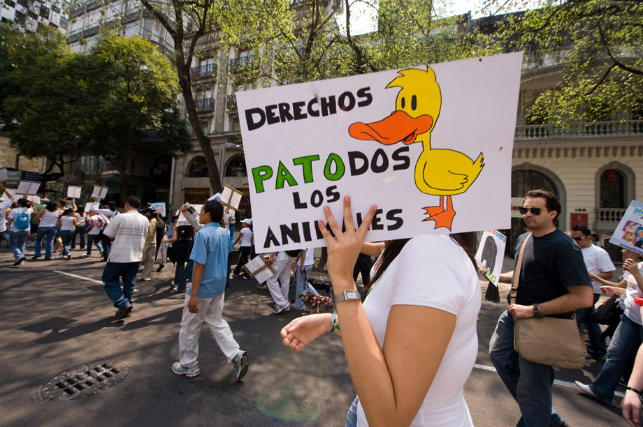 10月4日,在墨西哥首都墨西哥城,參加世界動物日活動的人們頭帶面具,手舉圖片,呼吁人們關(guān)注動物權(quán)益。來源:中國新聞網(wǎng)