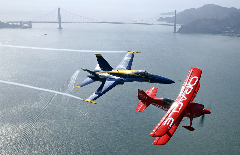 2009年10月8日,美軍飛機(jī)在舊金山灣上空進(jìn)行飛行演練。一年一度的舊金山艦隊(duì)周將于10月10日開幕,屆時(shí)會(huì)有船艦游行和飛行表演等活動(dòng)。 來源:中國(guó)新聞網(wǎng)