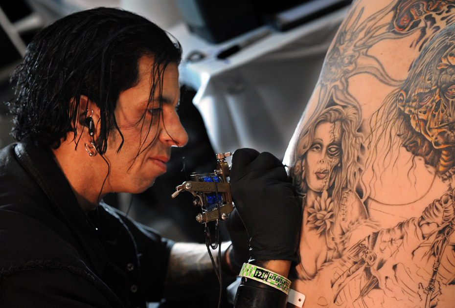 圖為觀眾在人體紋身藝術(shù)博覽會(huì)上紋身。