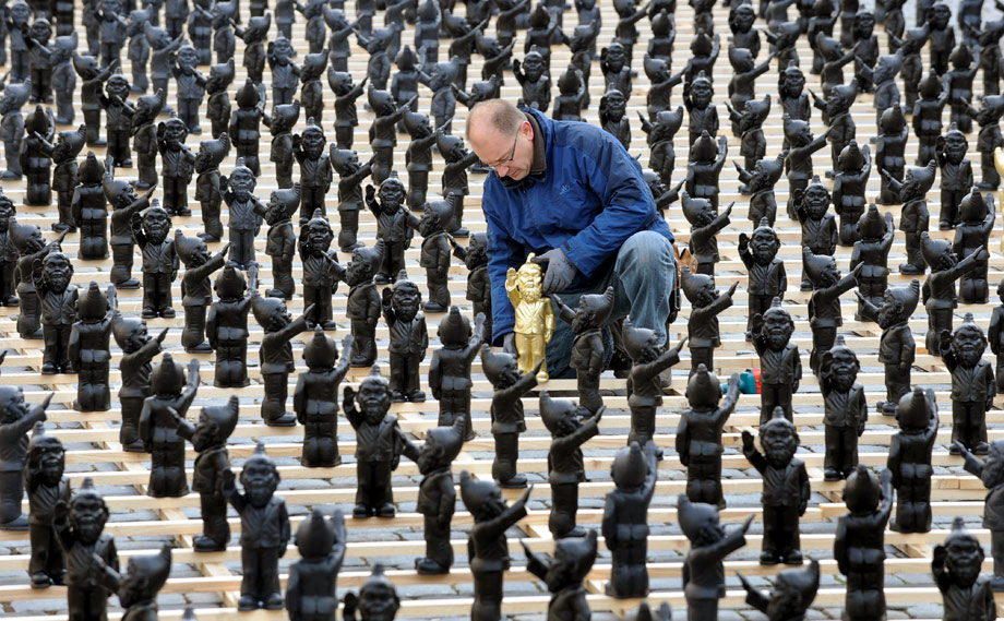 10月14日,德國(guó)施特勞賓市街頭擺放了1250個(gè)行納粹禮的花園土地神像,“行納粹禮的花園土地神”其實(shí)是一款雕塑作品,是由59歲的德國(guó)藝術(shù)家奧特馬爾·赫勒爾創(chuàng)作的目的在于提醒人們警惕法西斯思想,反對(duì)使用法西斯思想控制大眾。