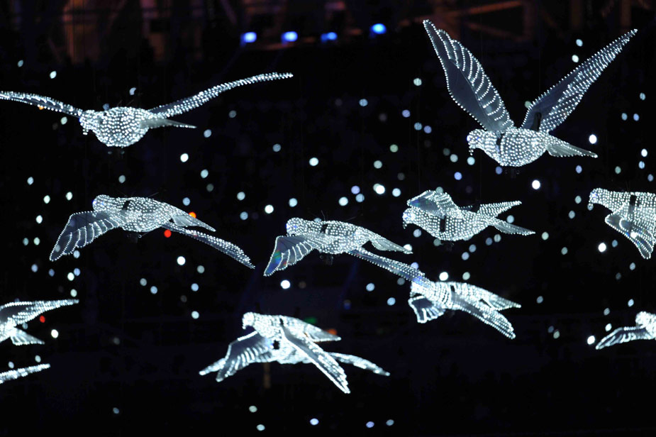 十月十六日晚,中華人民共和國第十一屆運動會在山東濟南奧體中心隆重開幕。開幕式晚會上和平鴿在體育場飛翔。中新社發 陳文 攝
