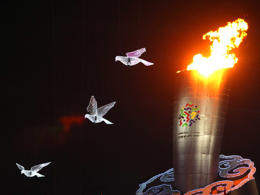 十月十六日晚,中華人民共和國第十一屆運動會在山東濟南奧體中心隆重開幕。圖為第十一屆全國運動會圣火在山東濟南點燃。中新社發 富田 攝
