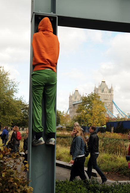 10月16日,來自奧地利的藝術(shù)家威利·多勒帶著他的城市空間人體藝術(shù)團隊,在倫敦街頭進行藝術(shù)表演。幾十位表演者把自己的身體擠進通道入口、壁凹和任何能找得到的公共建筑的縫隙內(nèi),供人們欣賞。