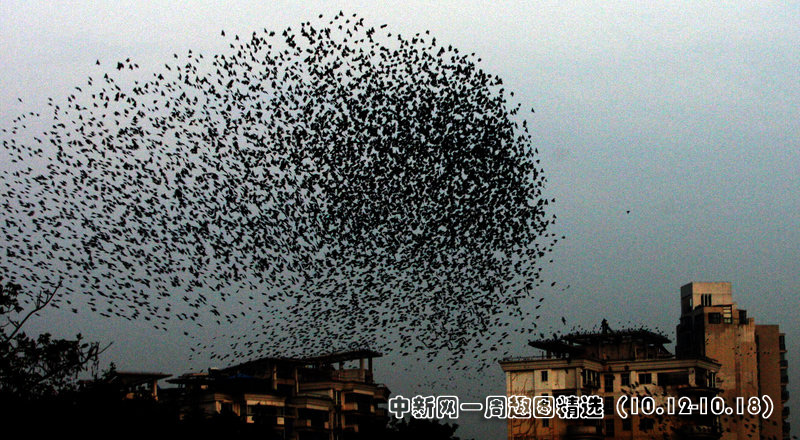 10月16日傍晚,近萬只椋鳥在湖北省武漢動物園樹林上空及旁邊居民小區旁飛翔,嘰嘰喳喳,熱鬧非凡,場面蔚為壯觀。圖片來源:CFP