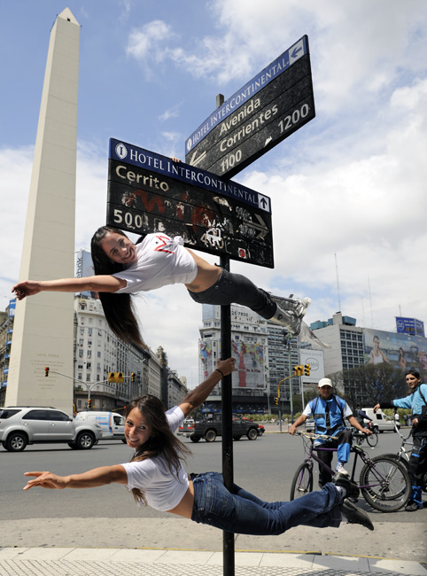 10月19日,阿根廷布宜諾斯艾利斯市街頭,鋼管舞小姐在街頭表演,路邊的路燈、電線桿變身為鋼管舞道具。圖片來(lái)源:中國(guó)新聞網(wǎng)