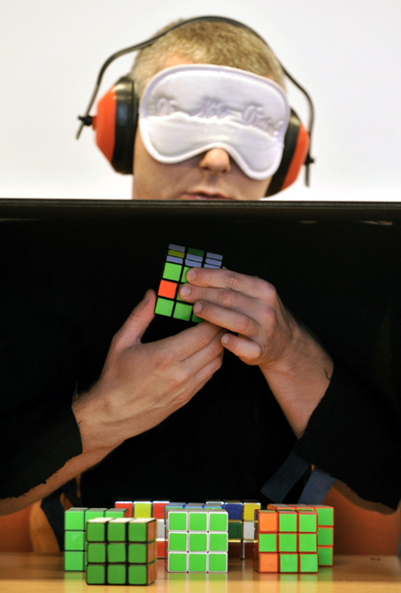 圖為一名參賽者在參加盲賽。10月18日,匈牙利魔方大賽在首都布達佩斯舉行,各路魔方高手展開對決。圖片來源:中國新聞網