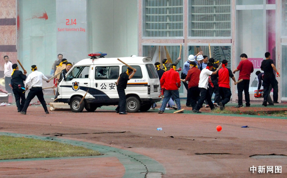 陸續(xù)涌來(lái)的“暴徒”,帶來(lái)了鐵棍、長(zhǎng)刀、鐵鏈等兇器,并結(jié)伙圍打執(zhí)勤民警,出現(xiàn)摔、砸商業(yè)設(shè)施和投擲礦泉水瓶等行為,在廣場(chǎng)上出現(xiàn)了反動(dòng)標(biāo)語(yǔ),“暴徒”不斷叫囂反動(dòng)語(yǔ)言,引發(fā)附近眾多群眾圍觀,鬧事人群已達(dá)200余人。曹多然 攝