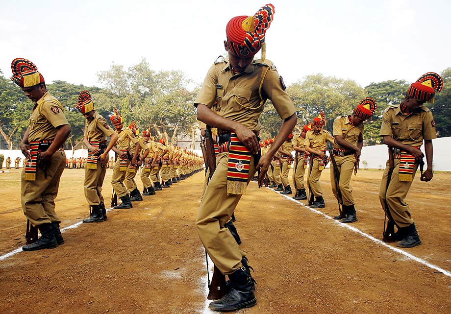 周三(21日),印度孟買,警方在一個紀念日上準備拔槍開火,向去年執行任務中喪生的同僚表示敬意。 來源:中國新聞網