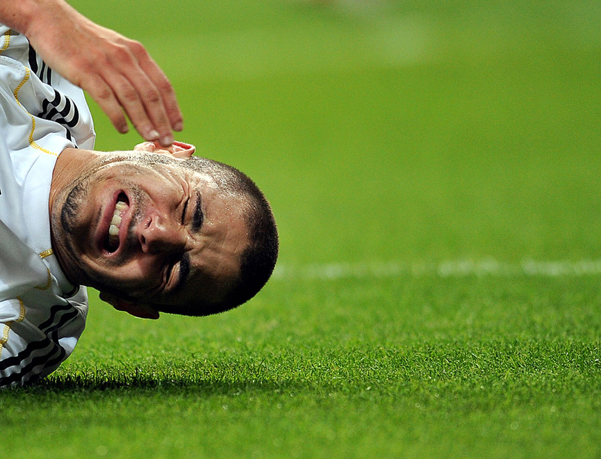 周四(22日)伯納烏體育場,皇馬前鋒本澤馬痛苦倒地。歐洲冠軍聯賽C組焦點戰,皇馬在伯納烏球場迎戰AC米蘭隊,皇馬以2比3告負。 來源:中國新聞網