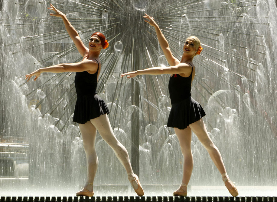 2009年10月23日,澳大利亞悉尼,來自紐約的全男班惹笑芭蕾舞團The Trocks在噴泉邊起舞。高超的足尖技巧,優美的芭蕾舞姿,加上怪異的動作滑稽的表情,這些美國男子芭蕾演員們用一種另類的表現力顛覆了人們心中優雅高貴的印象,讓觀眾欣賞傳統以外的男扮女裝芭蕾舞表演。